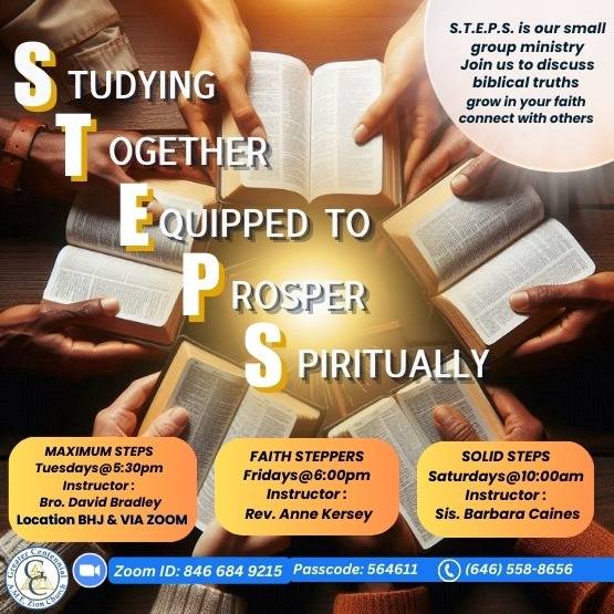 Join a S.T.E.P.S. small group to fellowship with others and grow in God’s Word together. Sessions are available on Tuesdays at 5:30 p.m., Fridays at 6:00 p.m., and Saturdays at 10:00 a.m.!